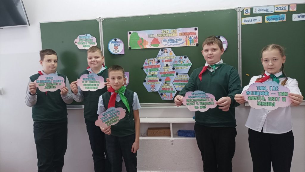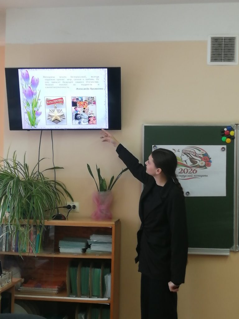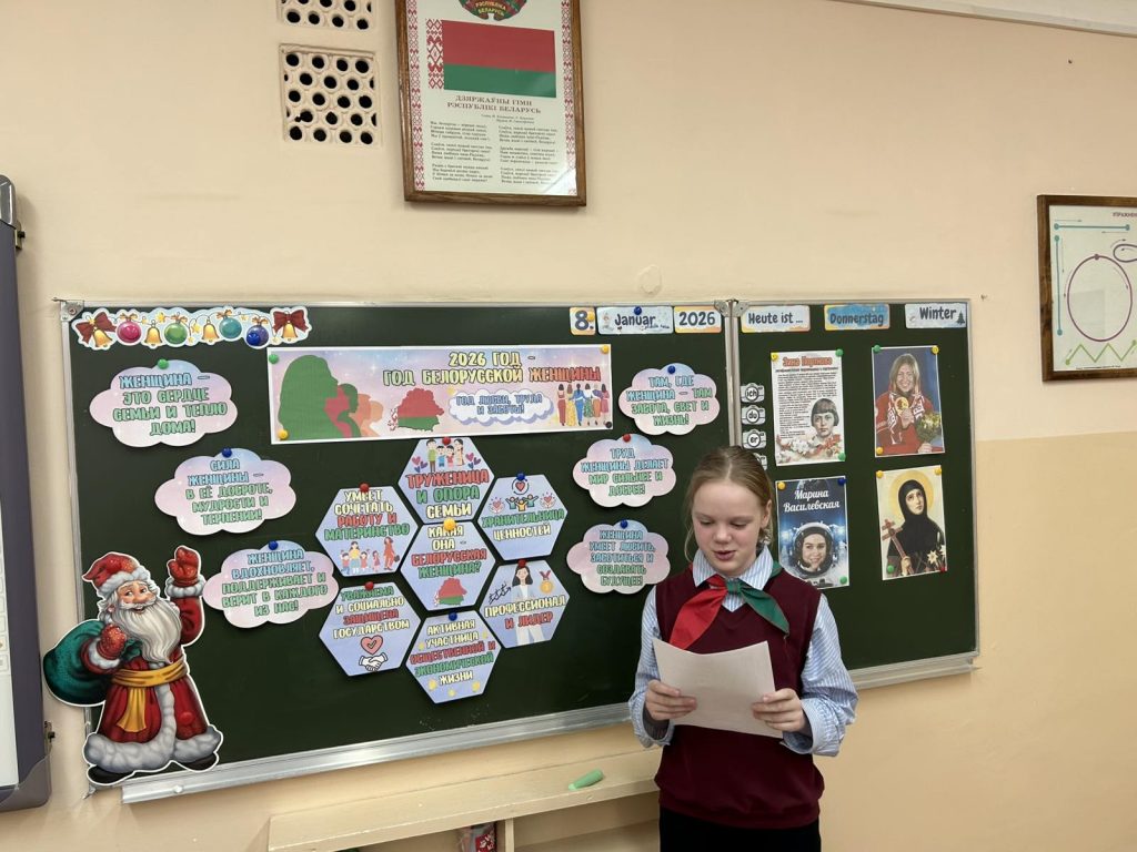 В целях формирования национального образа женщины-труженицы, популяризации роли женщин в сохранении и развитии общества 2026 год объявлен Годом белорусской женщины. Именно поэтому 8 и 9 января в средней школе №2 г. Жлобина прошли классные часы «2026 год- Год белорусской женщины». На данных мероприятиях педагоги имели хорошую возможность вместе с учащимися проанализировать значение семейных ценностей и материнства, чтобы сформировать у детей глубокое уважение к роли женщины в современной жизни страны. Ведь сегодня женщины – самая активная часть нашего общества. Они живут его интересами, не остаются в стороне от того, что происходит в родном крае, стране и мире, заявляют о себе значимыми делами и яркими проектами. Более того, многие успешно совмещают труд, материнство и общественную деятельность, добиваются высоких результатов в творчестве, профессиональной сфере. Ни одно социально значимое мероприятие не обходится без участия женщин.