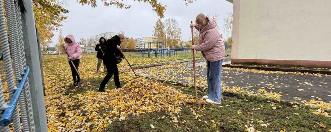 В рамках Республиканского субботника работники приняли участие в наведении порядка и уборке листвы на территории школы