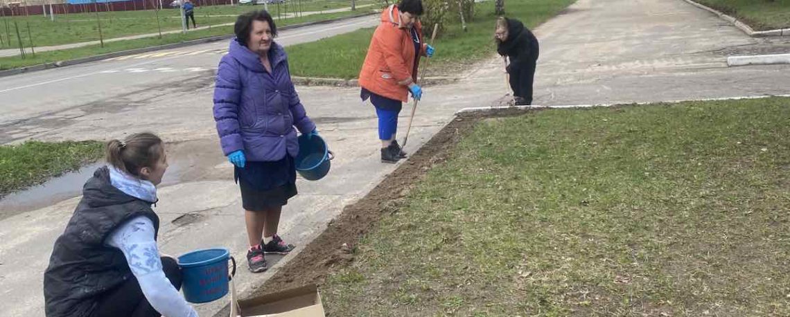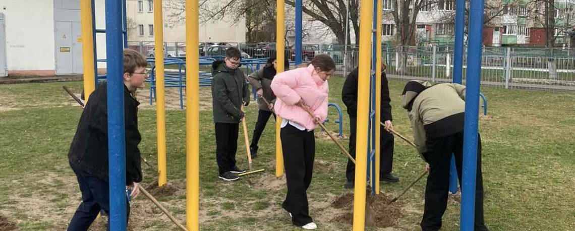Учащиеся дружно вышли на школьный двор, чтобы навести порядок на спортивной площадке, клумбах, в саду.