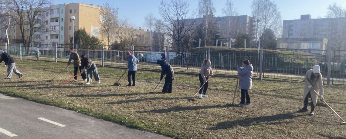 Дружно вышли сотрудники средней школы №2 г. Жлобина на уборку пришкольной территории.
